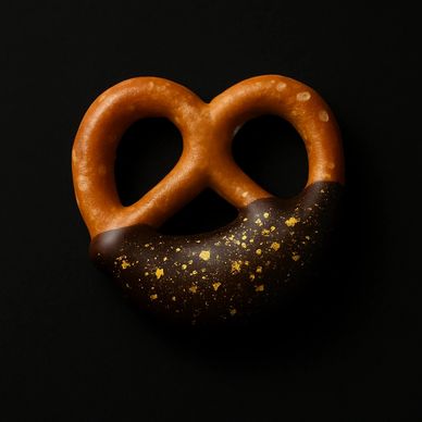 Salty pretzel twists enrobed in premium chocolate and accented with shimmer, drizzle, or gold leaf.